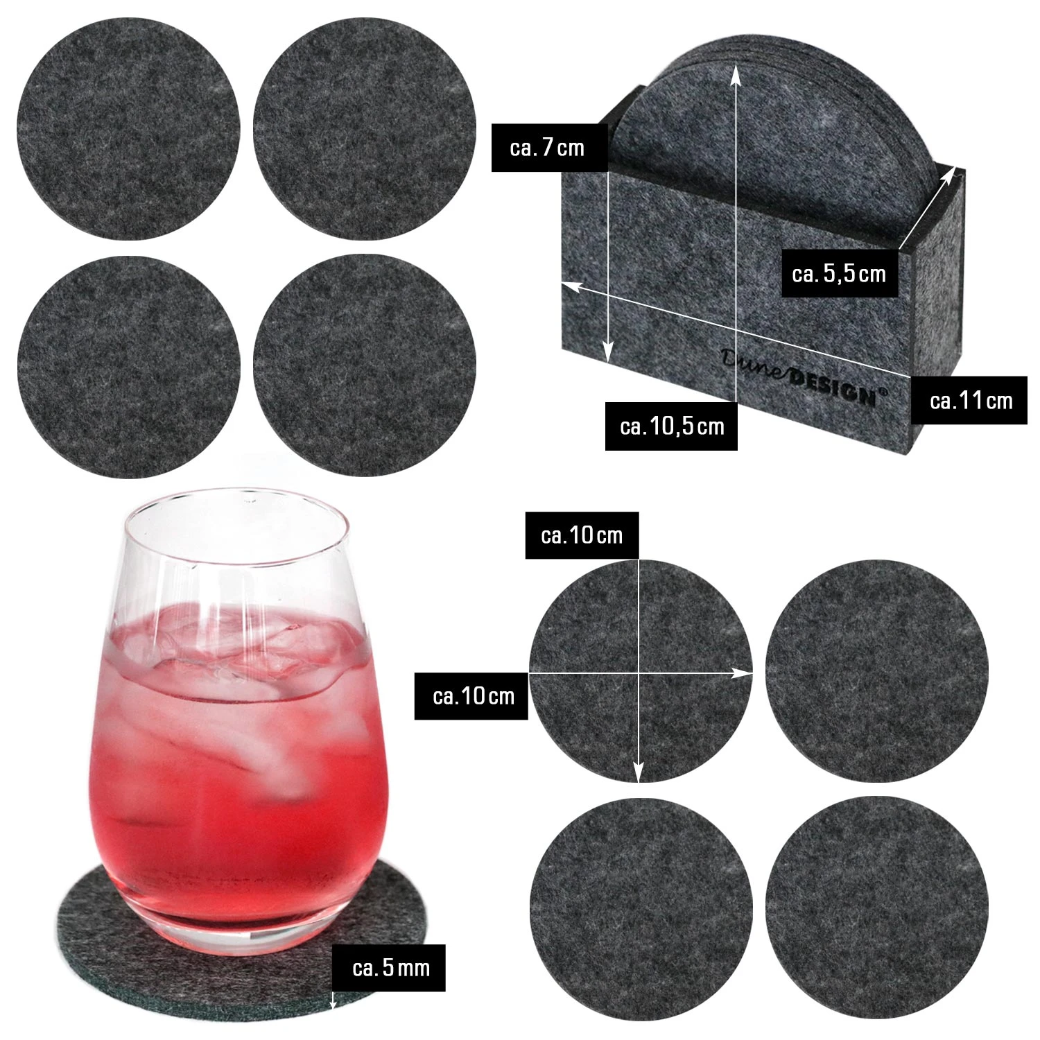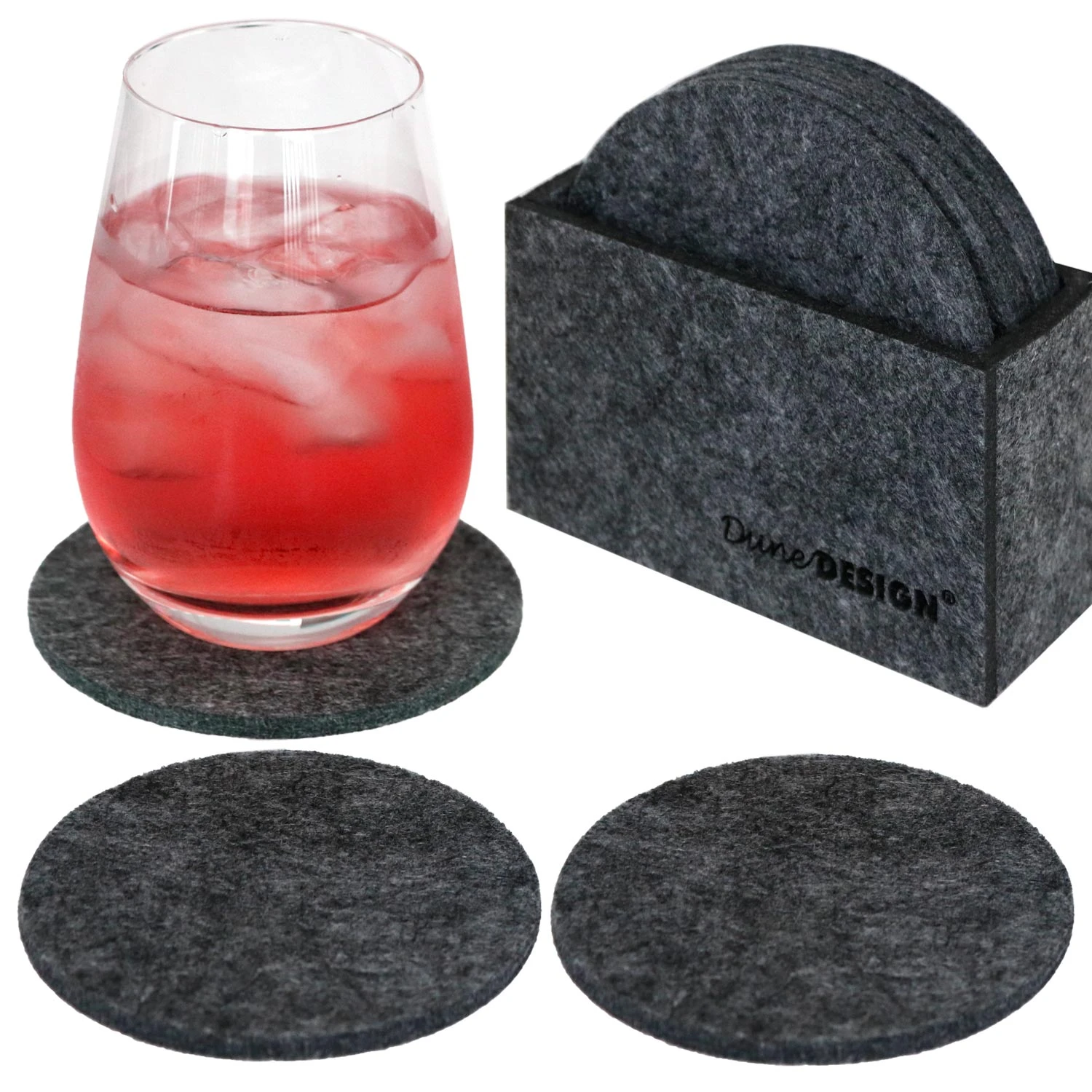– Acht runde Filz-Untersetzer mit passender Aufbewahrungsbox aus Filz