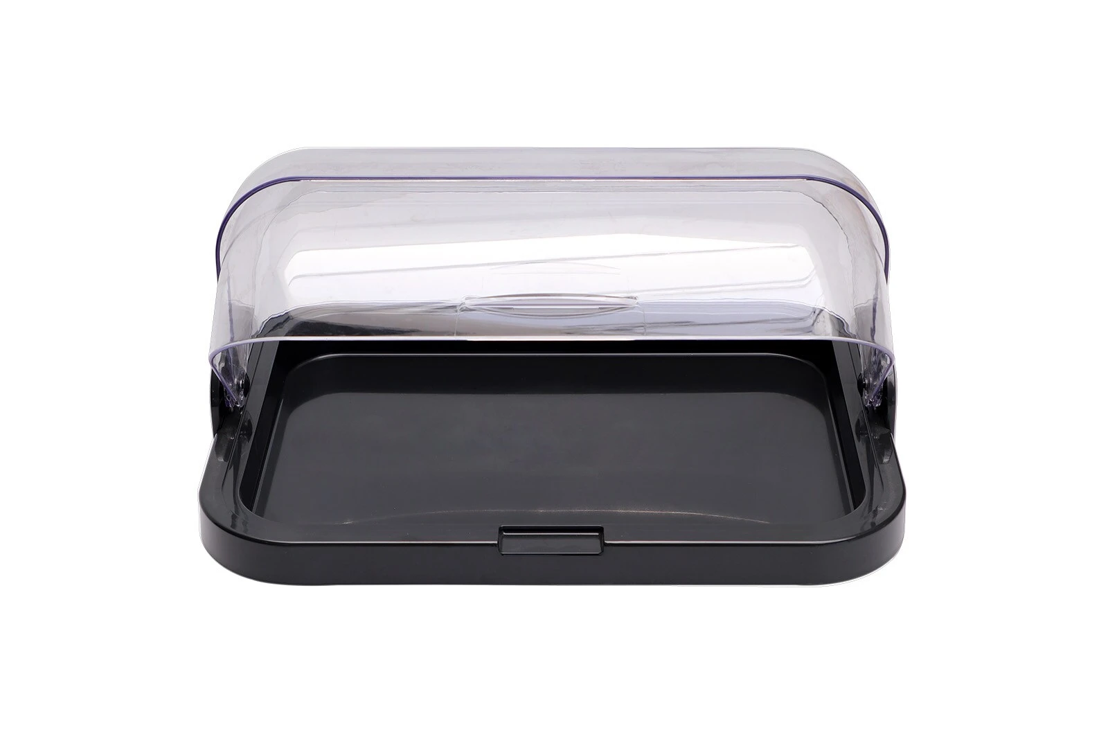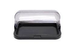 Buffetvitrine 44 x 32 cm, H: 20,5 cm bestehend aus: – Basis aus ABS, schwarz – Tablett aus 18/0 Edelstahl – Rolltop-Haube aus SAN – 2 Kühlakkus