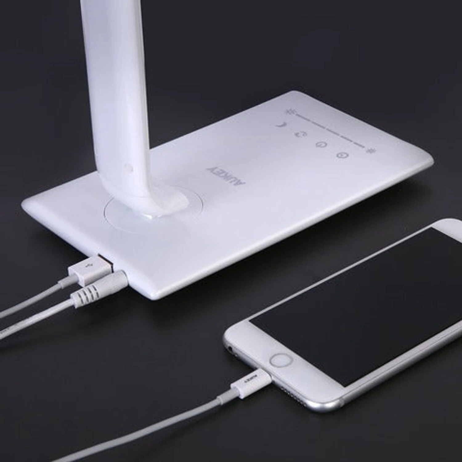 Aukey LT-T10-Whi LED Nachttischlampe, Berührungssteuerung Tischlampe mit 5 Farbtemperaturen, 5 Helligkeitsstufen, Nachtlichtmodus, 1-Stunden-Timer und USB-Ladeanschluss