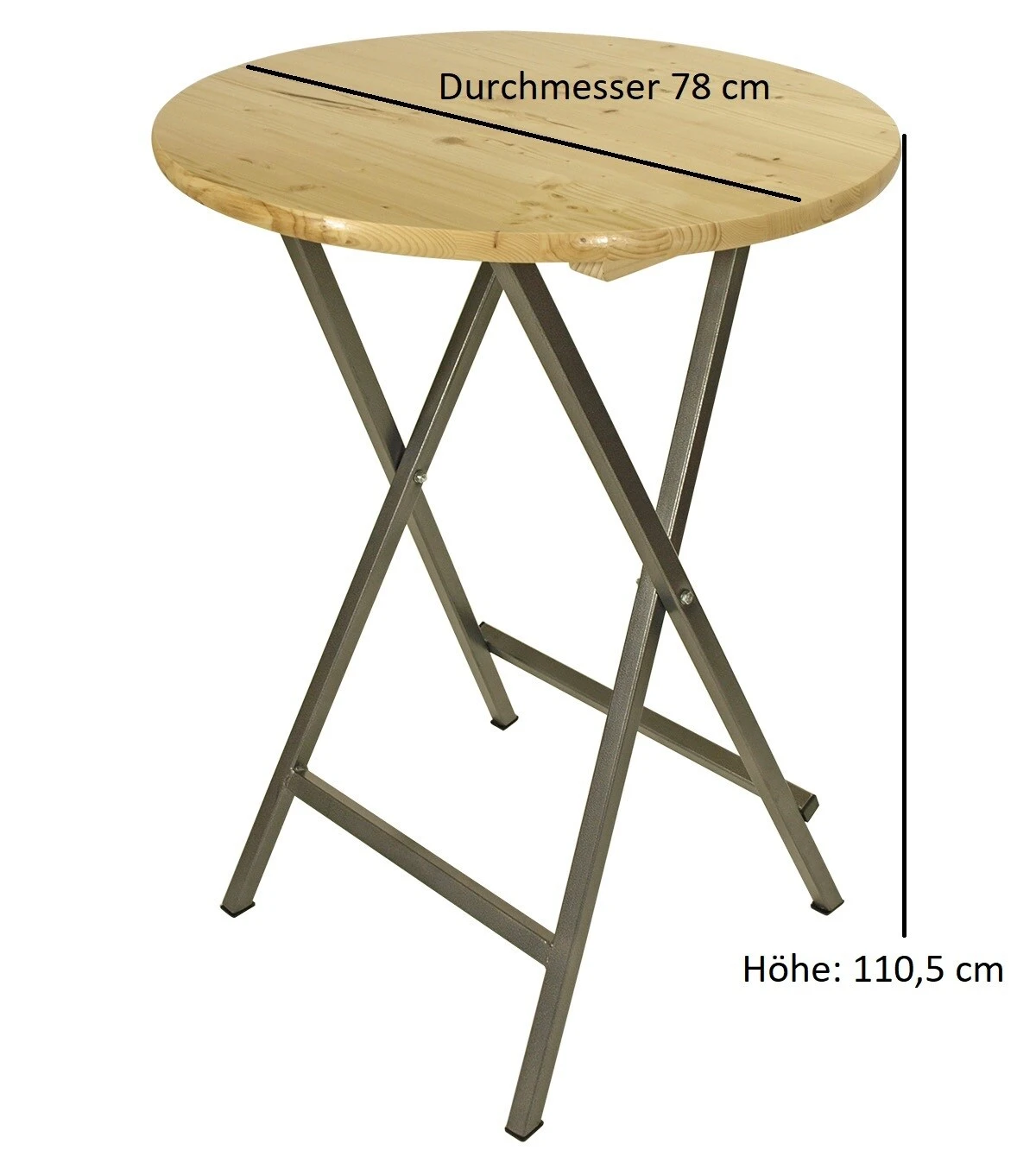 Extra stabiler Party – Stehtisch ZÜRICH in Profi-Ausführung. Die runde Tischplatte hat einen Durchmesser von 78cm, Höhe des Tisches 110,5cm. Durch die Verwendung von extra starkem Nadelholz / 28mm ist der Tisch besonders stabil und solide.