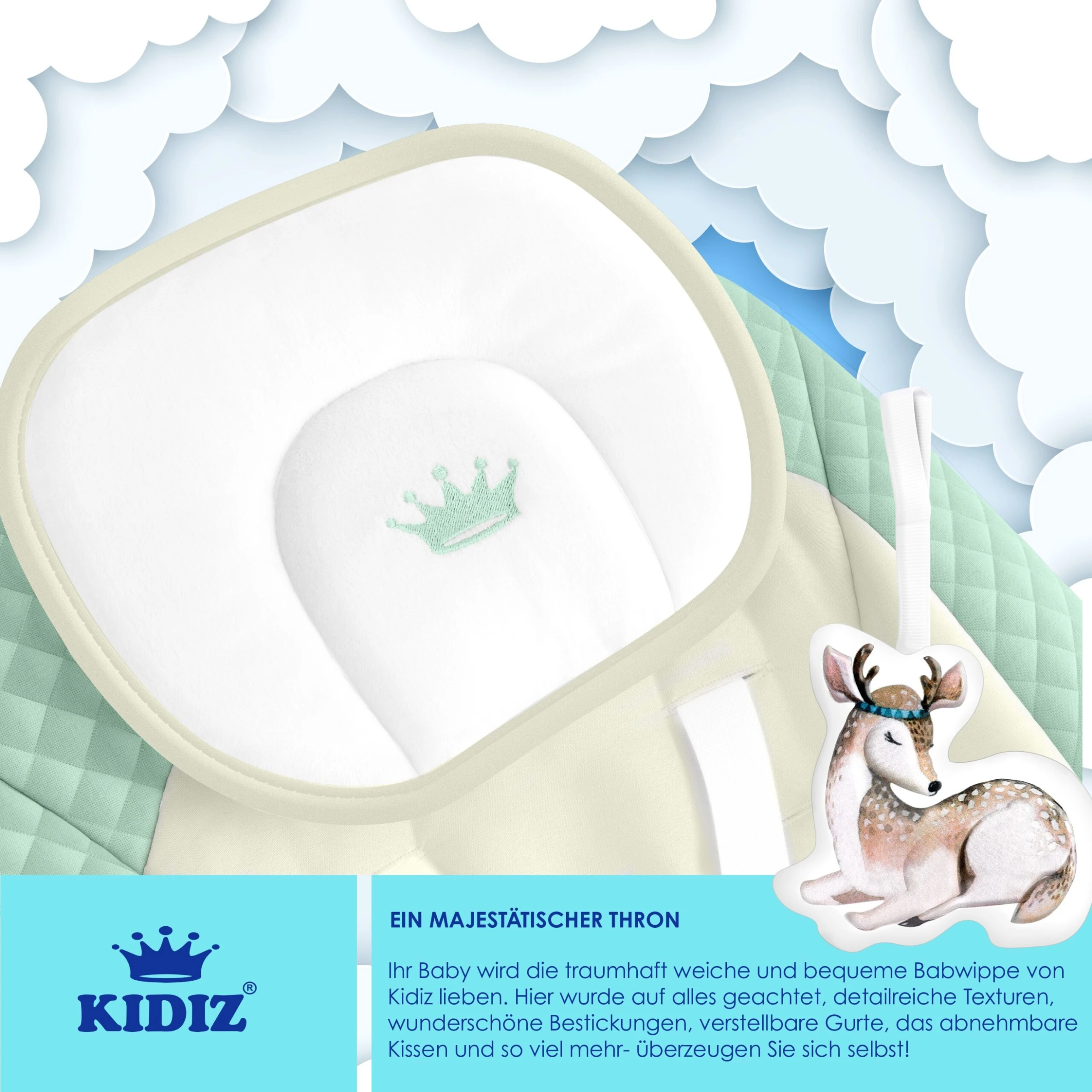 Ein majestätischer Thron – Ihr Baby wird die traumhaft weiche und bequeme Babywippe von KIDIZ lieben. Hier wurde auf alles geachtet, viele detailreiche Texturen, wunderschöne Bestickungen, verstellbare Gurte, ein abnehmbares und weiches Kissen und vieles mehr. – Überzeugen Sie sich selbst! Der Babykorb hat eine sehr beruhigende Wirkung auf Ihr Kind und sorgt gleichzeitig für Unterhaltung und Spaß.