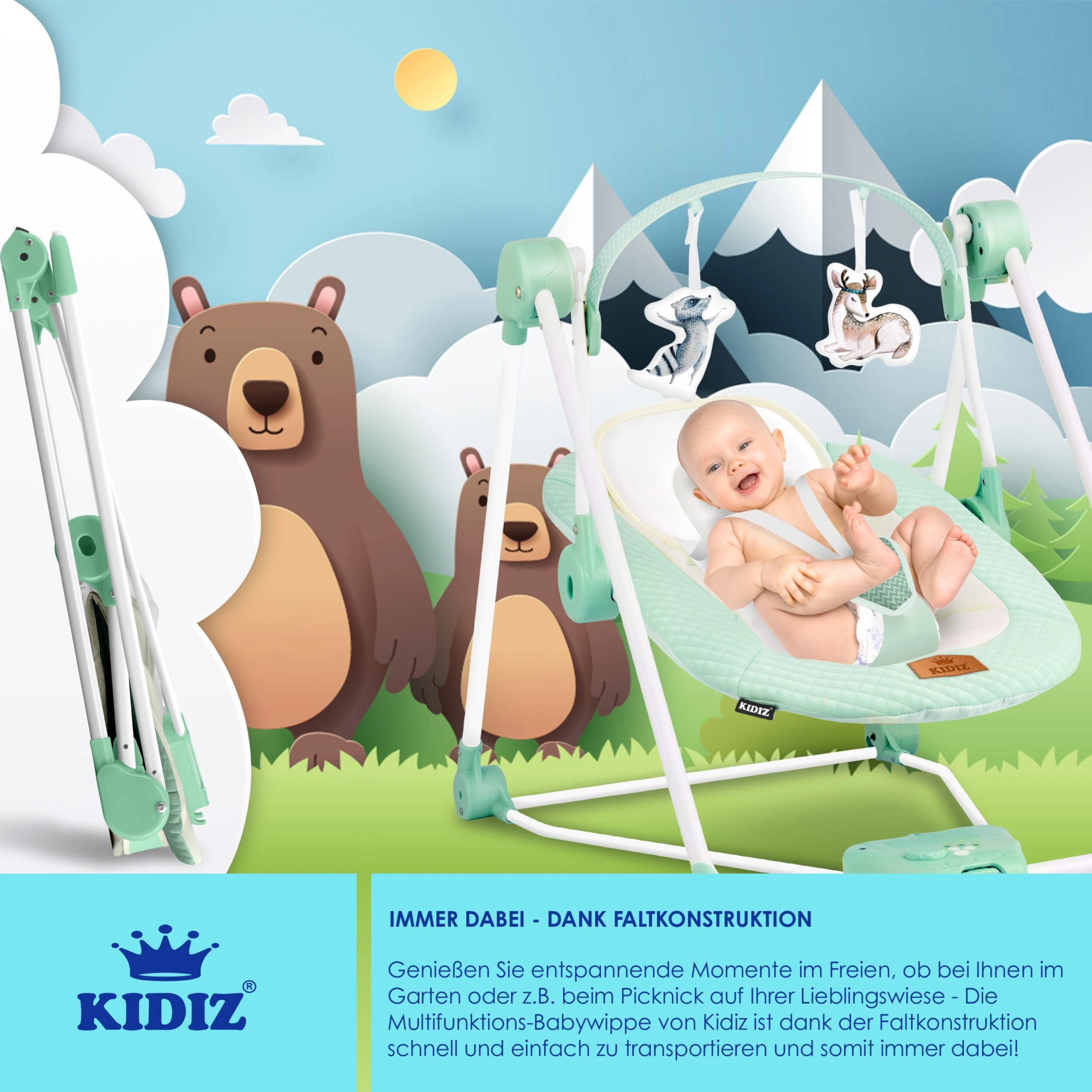 KIDIZ Babywippe mit 5 Sounds aus der Natur und 5 Geschwindigkeits-Schaukeleinstellungen sorgt für eine beruhigende Wirkung auf Ihr Kind, sicher und stabiler Stand auf allen Böden , Inkl. Timer, 2 Plüschtieren und weiterem Zubehör