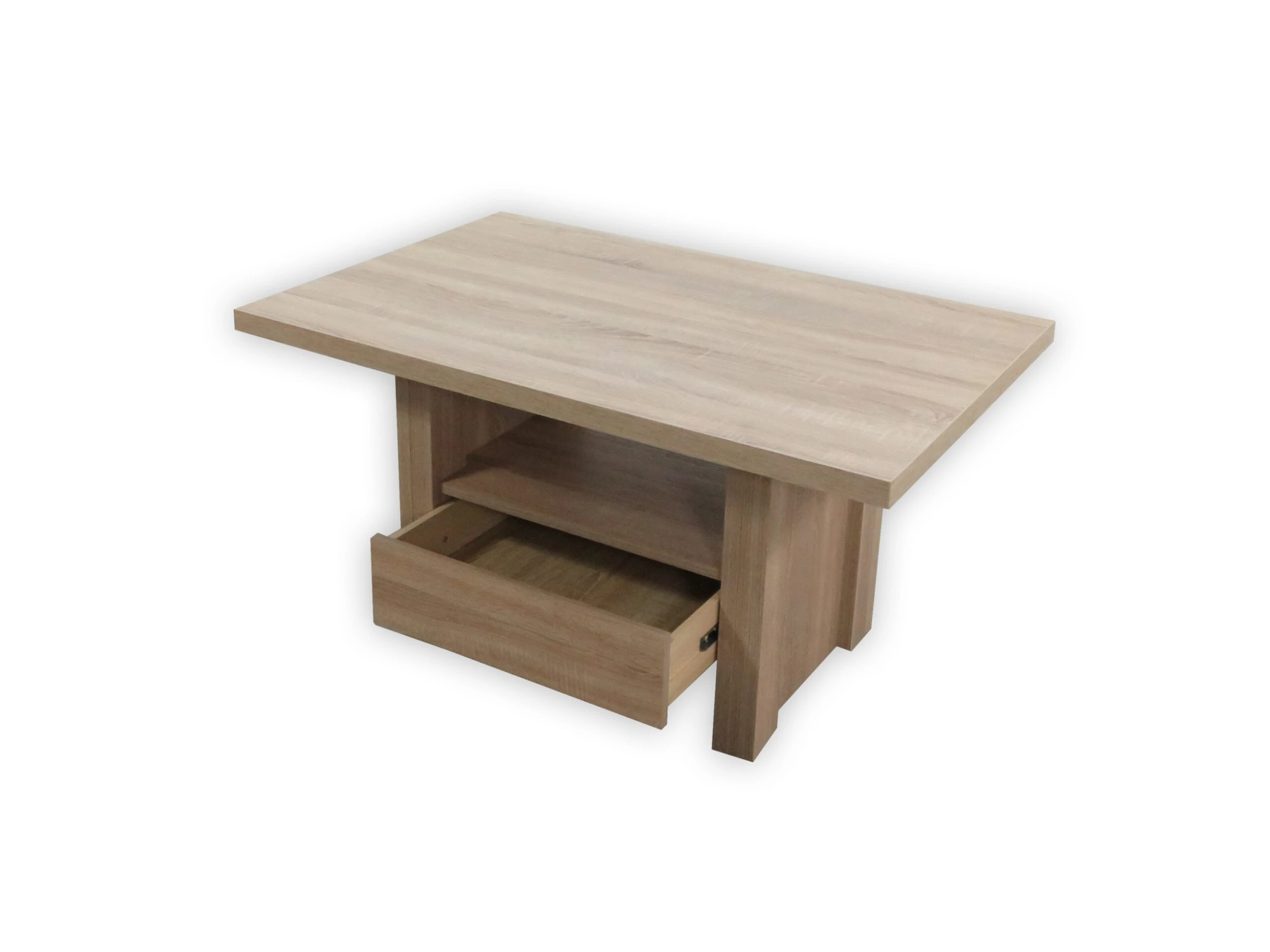 Moderner, funktioneller Couchtisch komplett aus Holzwerkstoff gefertigt. Unten ein praktischer Schubkasten, darüber Ablageboden. Oben große Tischplatte ca. 105 x 67 cm. Die pflegeleichte, glatte Oberfläche ist mit einem trendigen Holzdekor, Sonoma-Eiche-Nachbildung, beschichtet. Lieferung vom Couchtisch erfolgt zur Selbstmontage, inklusive Aufbauanleitung. Maße ca. cm: (B/H/T) 105/55/67.