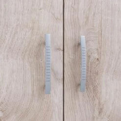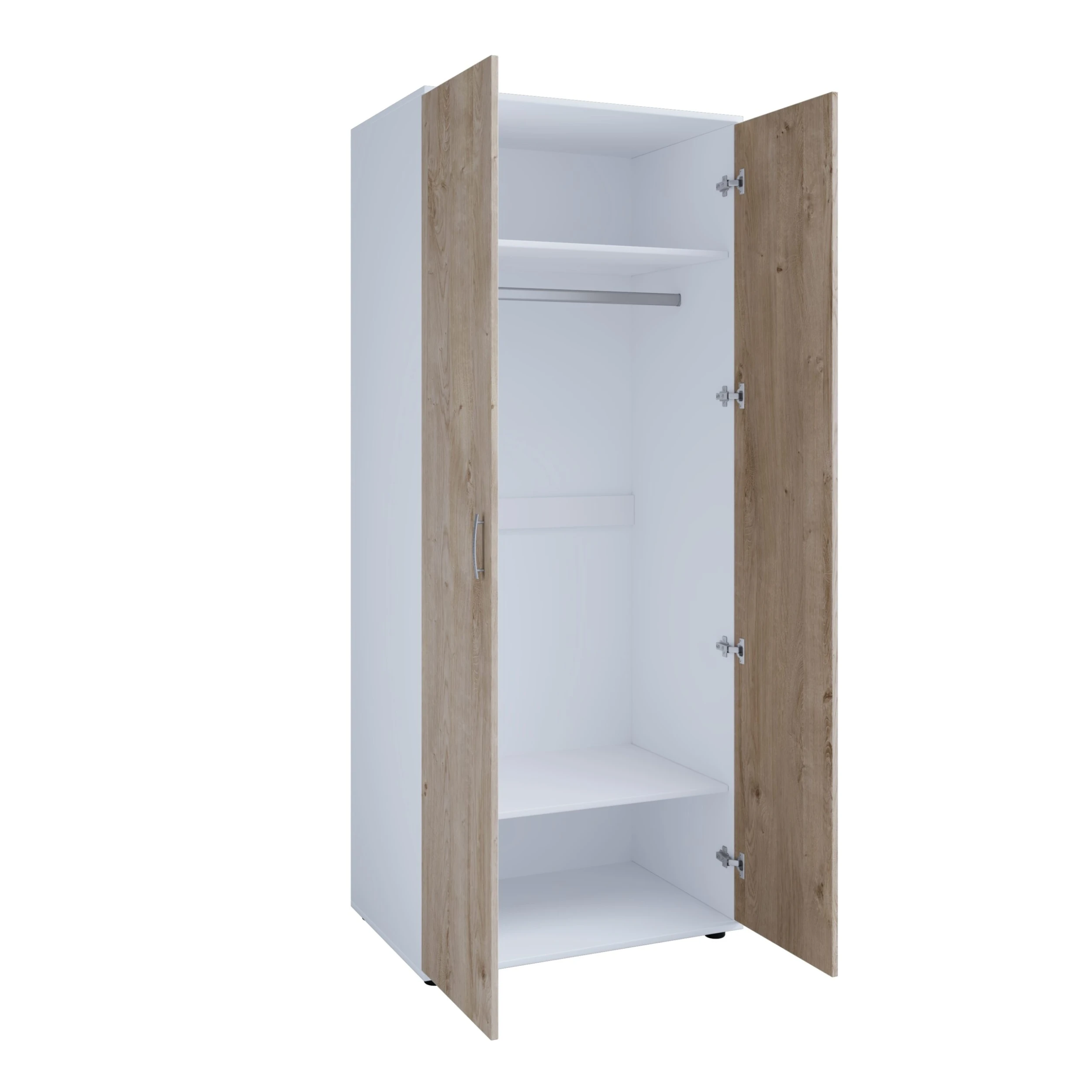 Kleiderschrank mit 2 Drehtüren. Mit der pflegeleichten Melamin Oberfläche in Dekor Weiß, Front Eiche Desmond Silbergrau, ist es ideal für das Kinderzimmer. Der Schrank bietet viel Stauraum im Kinderzimmer. Die praktische Inneneinteilung sorgt dafür, dass alles seinen richtigen Platz findet. Der obere Einlegeboden ist nicht verstellbar. Das Fachinnenmaß oben ist ca.: B: 76 x H: 33 x T: 52 cm. Darunter befindet sich eine Kleiderstange aus Metall für die Hängemöglichkeit (Abstand vom oberen zum unteren Boden ca. 111 cm). Unten befindet sich ein weiterer Einlegeboden als Ablagemöglichkeit. Das Fachinnenmaß darunter ist ca.: B: 76 x H: 38 x T: 52 cm. Die gewölbten Bügelgriffe auf den Türen sind aus Kunststoff in Alu-Optik. Das Trägermaterial ist Holzwerkstoff, mit hochwertiger ABS Kante beim Korpus, die Rückwand ist innen weiß, Artikel mit Wandbefestigung. Die Dekoration gehört nicht zum Lieferumfang. Die Bodenfreiheit ist ca. 2 cm. Der Artikel ist zerlegt, mit Aufbauanleitung zur einfachen Selbstmontage. Die Stellfläche Kleiderschrank 2-trg. ist ca. B: 80 x H: 198 x T: 54 cm.