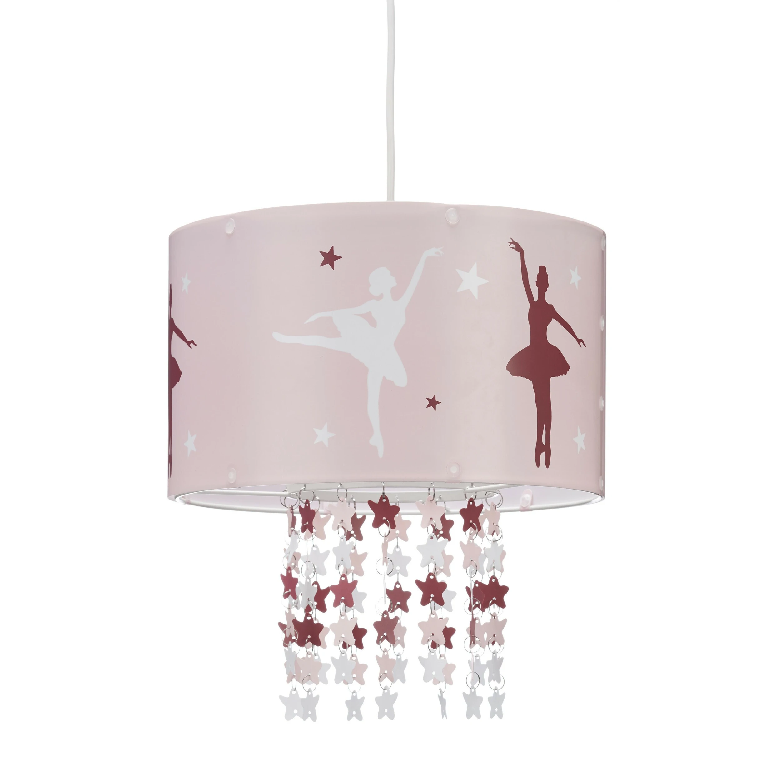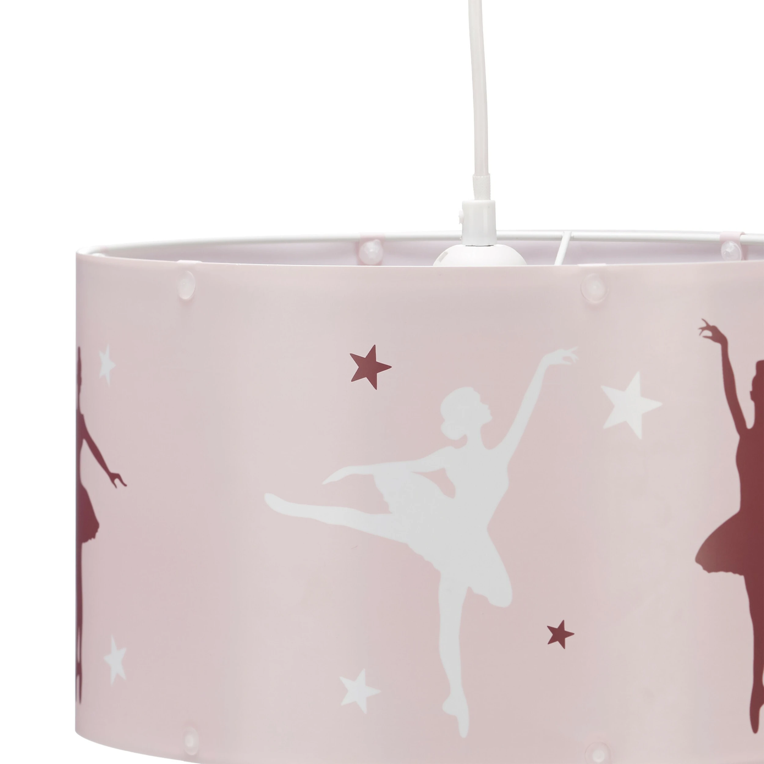 Die niedliche Kinderlampe bezaubert durch ein schönes Motiv von zwei tanzenden Ballerinen. Der runde Lampenschirm im zarten Rosa ist ein wahr gewordener Mädchentraum, der in keinem Kinderzimmer fehlen darf. Am weißen Metallgestell sind 13 Ketten mit kleinen Sternen befestigt, die bei eingeschaltetem Licht faszinierende Schatten auf Wände und Boden werfen. So kann Ihr Kind wie die Ballerina umringt von Sternen tanzen.