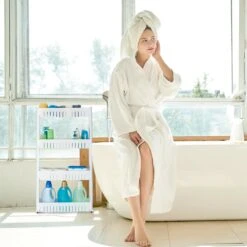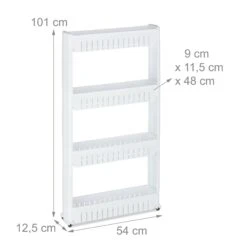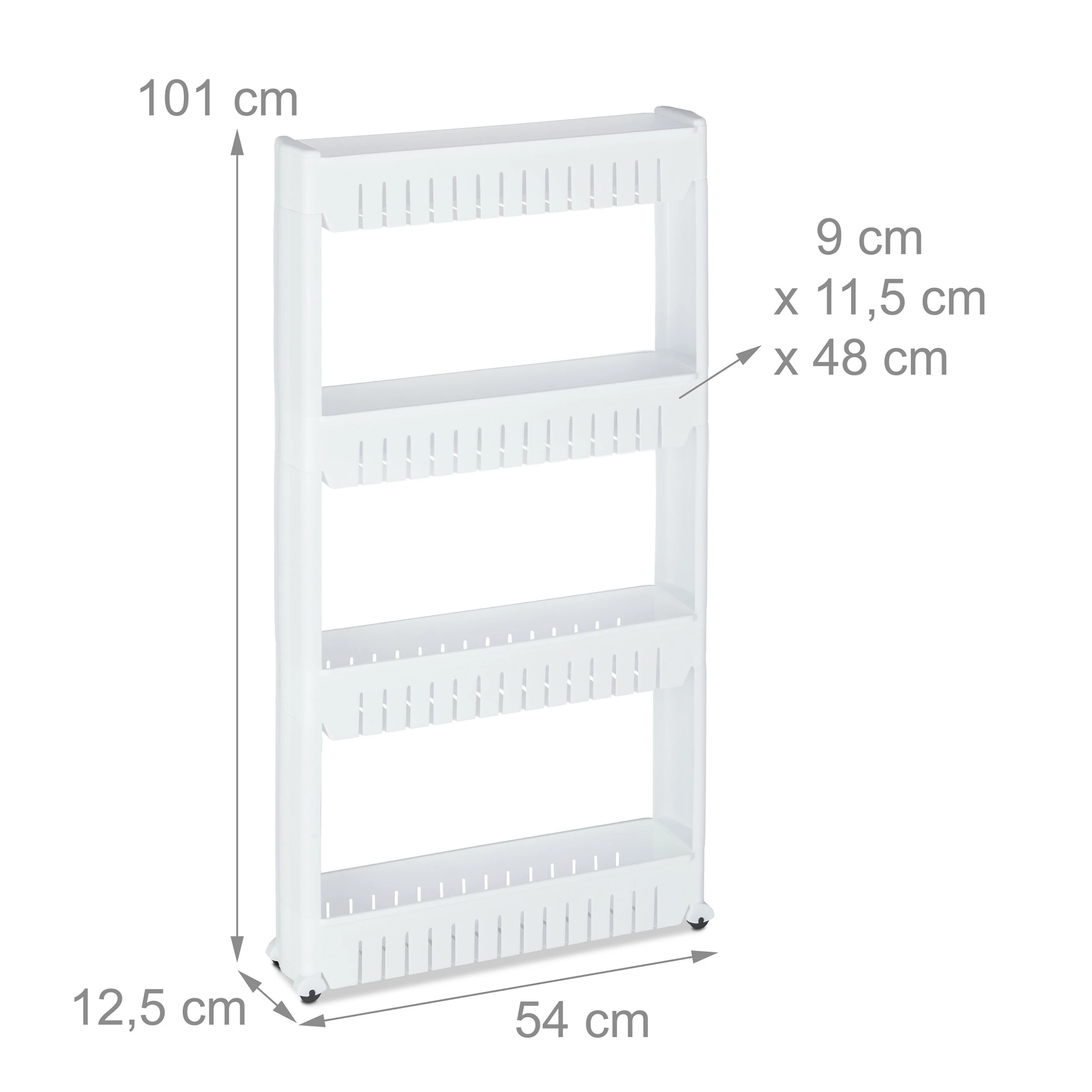 Der Rollwagen ist das perfekte Möbelstück für Bad oder Küche, um auch in engen Nischen und Ecken praktischen Stauraum zu schaffen. Mit 4 Ablagen bietet das schmale Nischenregal ausreichend Platz für Badutensilien, Küchenzubehör und andere Dinge des Alltags. Dank des offenen Designs und der 4 Rollen lässt sich der Nischenwagen bequem hin und her schieben und Du hast die verstauten Utensilien sofort griffbereit. Der Aufbau des Schieberegals geht dank des Stecksystems kinderleicht von der Hand.