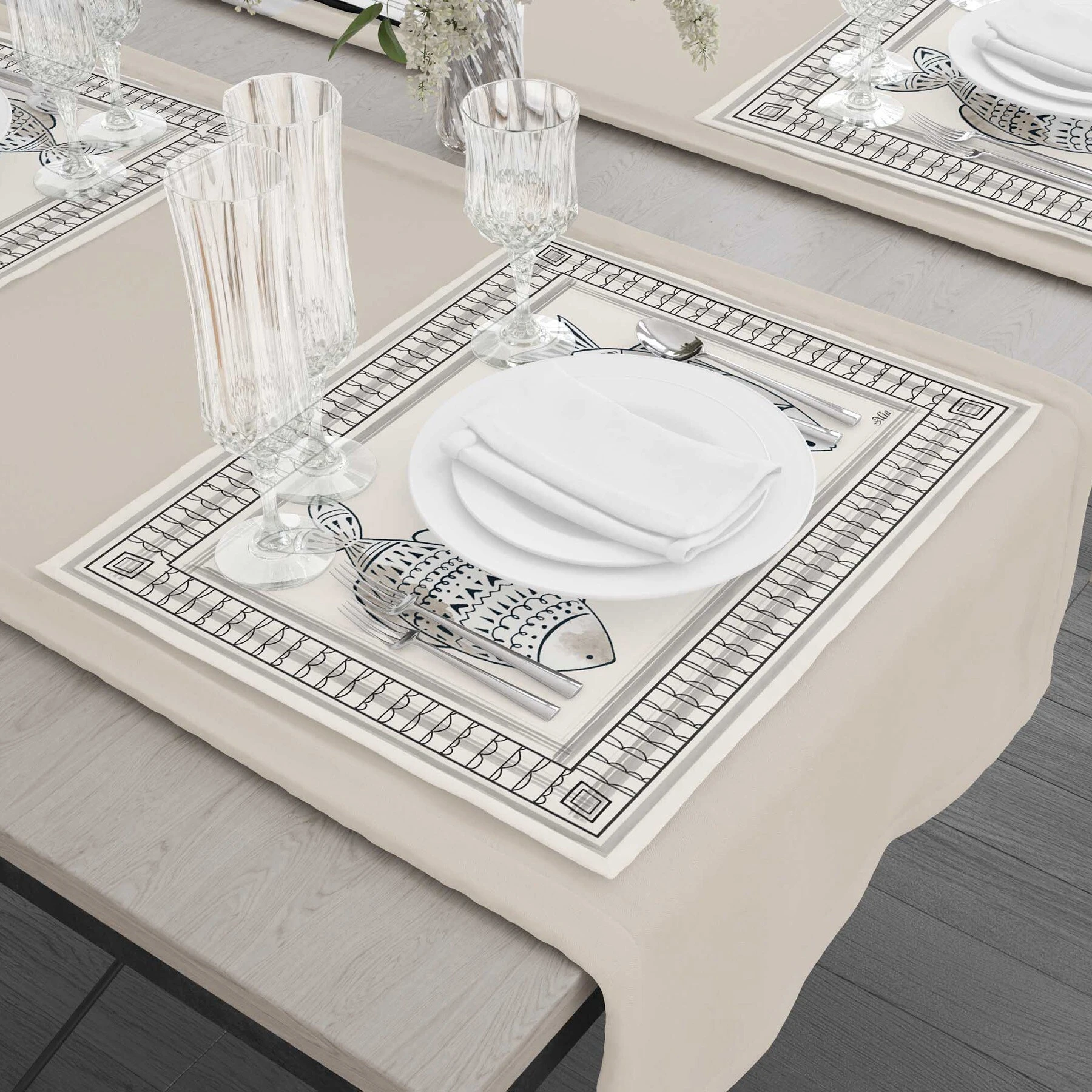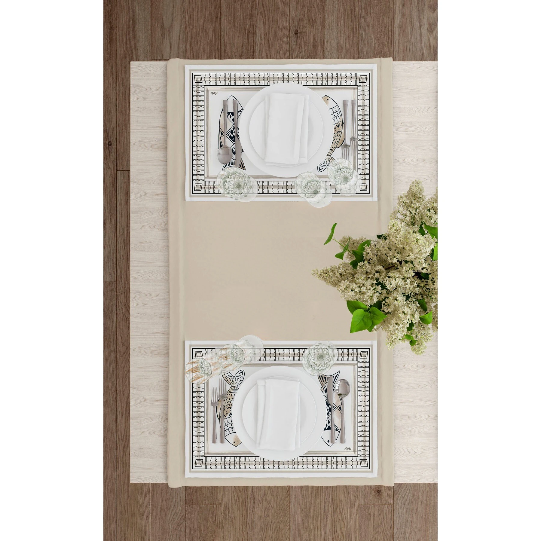 Das Set besteht aus 6 amerikanischen Telleruntersetzern. Hergestellt aus fleckenabweisendem Stoff. Kann bei 30 Grad in der Waschmaschine gewaschen werden. Die Produktmaße sind 50 x 25 cm. Der Stoff ist zu 100% aus Polyester.