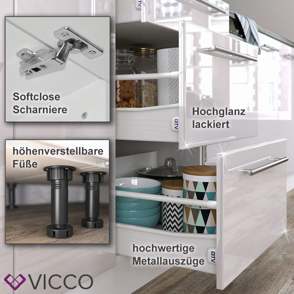 Die bequemen Softclose Scharniere bieten ein bequemes Handling und die hochwertigen Metalauszüge der Schubladen sorgen für eine lange Lebensdauer der Küchenmöbel. Die Schränke sind mit höhenverstellbaren Stellfüßen ausgestattet, dank denen sich Bodenunebenheiten mühelos ausgleichen lassen.