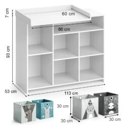 • Die Gesamtmaße der Kommode betragen 113 x 100 x 45 cm (BxHxT), die Faltboxen sind 30 x 30 x 30 cm (BxHxT) und die der Wickelauflage 86 x 7 x 60 cm (BxHxT).
