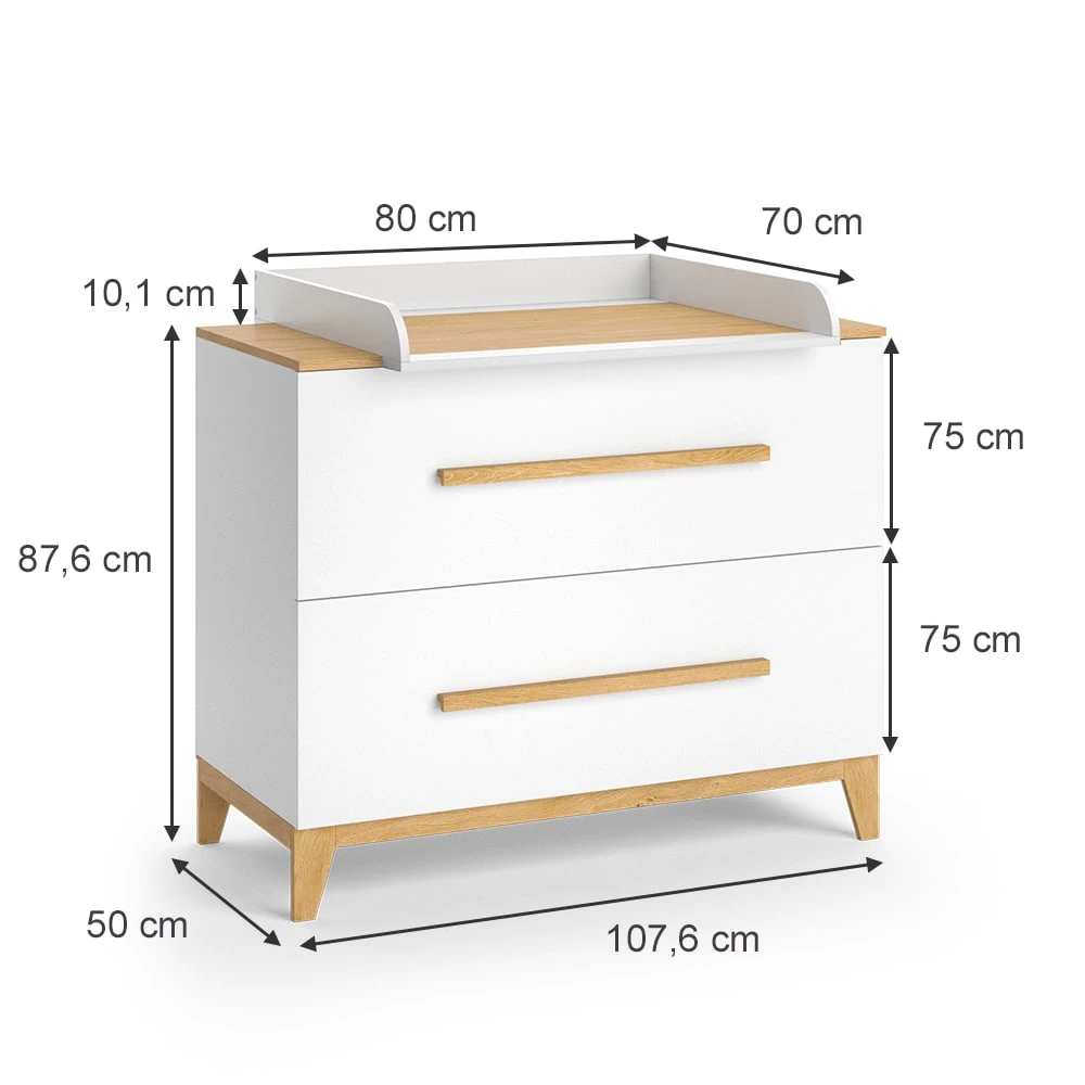 • Die Gesamtmaße betragen bei der Wickelkommode 107,6 x 87,6 x 53,6 cm (BxHxT) und bei der Wickelauflage 80 x 10,1 x 70 cm (BxHxT).